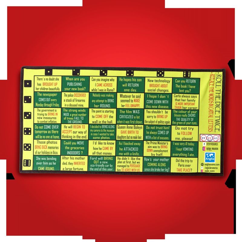 * Phrasal Verbs Juegos de Aprendizaje. * Board Tema :Phrasal Verbs Bring/Come *Medidas: 35x45 cm c/u. *Incluye: 1 Teacher's Guides + Estuche pvc crystal + 1 Dado de acrilico de 19 mm. *Material: Tela resistente. Sublimada. *Excelente Diseño y Calidad. *Funciones: Replace the Words in Capital letters. *Objetivos: 1-Vincular el Aprendizaje de los Phrasal Verbs con el Entretenimiento.2-Proporcionar una periódica Evaluac. del Aprendizaje.3-Proporcionar práctica y feedback. *CEFR Level B1 - B1+ - B2